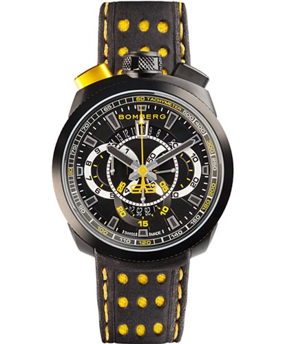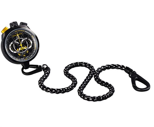 Orologio cronografo Made in Switzerland con cassa in acciaio 45.00 mm, inserti ed indici in colore giallo. Cinturino in pelle nero con trapunti in colore giallo. Fornito di catena in acciaio di colore nero per trasformarlo in un elegante pocket-watch.