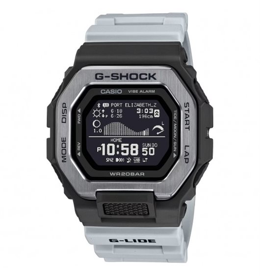 G-Shock orologio GBX-100TT-8ER Orologio multifunzione ideato in particolare per il surf ma con configurazioni utili a vari sport. Movimento al quarzo e connettività Bluetooth®. Cassa antiurto in resina nera dalle dimensioni di 50,9 mm x 46 mm e spessore di 14,7 mm. Lunetta in acciaio inox. Quadrante digitale con visualizzazione dell'orario in formato 12 o 24 ore, datario automatico, grafico delle maree, dati sulle fasi lunari, visualizzazione dell'orario dell'alba e del tramonto e delle funzioni attive. Retroilluminazione LED automatica tramite rotazione del polso. Cinturino in resina grigio chiaro, chiusura con fibbia ardiglione. Funzioni di training con accelerometro per visualizzazione della distanza, della velocità e dell'andatura; profilo personalizzabile con impostazione di obiettivi. Memoria dei dati d'allenamento fino a 100 corse e 140 giri per ognuna. Visualizzazione dei fusi orari, cronometro con accuratezza di 1 centesimo di secondo fino a 100 ore, timer per il conto alla rovescia e fino a 4 allarmi giornalieri con vibrazione e funzione snooze. Attivazione e disattivazione del suono dei tasti. Resistente all'acqua fino a 200 metri di profondità. L'articolo è venduto su concessione ufficiale e viene spedito in tutto il mondo completo di confezione originale e garanzia internazionale valida 24 mesi.