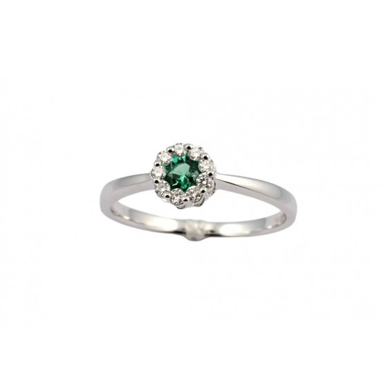 anello solitario in oro bianco 18 KT.,con Smeraldo centrale di kt. 0.17 e contorno di diamanti taglio brillante di kt. 0.13 in totale. Colore G Purezza VS Misura 14
