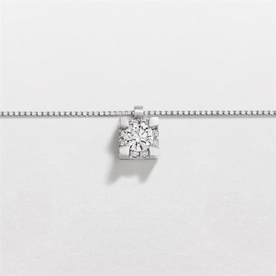 Girocollo punto luce in oro bianco 18 kt. della collezione IO LUCE, con diamante taglio brillante montati su 4 griffes del peso di ct. 0.30 e diamanti taglio brillante incastonati di ct. 0.05 in totale. Purezza VS Colore F Correlato da Certificato di Sostituzione gratuito valido 3 anni, qualora lo stesso venga rubato, scippato, rapinato o venisse distrutto da incendio