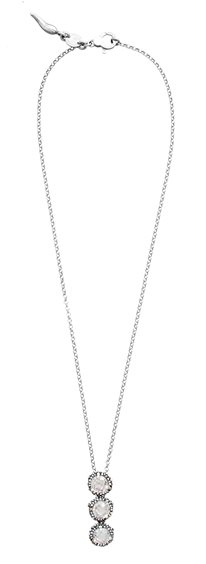 Pendente Cascata Shine. In questo pendente, tre luminosissimi zirconi trasparenti, muniti di catena in argento di 45 centimetri, dialogano con l'eleganza contemporanea del decoro stile Perlage in argento brunito. Realizzato interamente a mano in azienda.