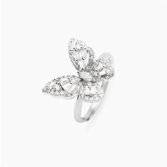 Anello in argento 925 rodiato e zirconi bianchi. Farfalla con zirconi bianchi. Misura regolabile da 11 a 19.