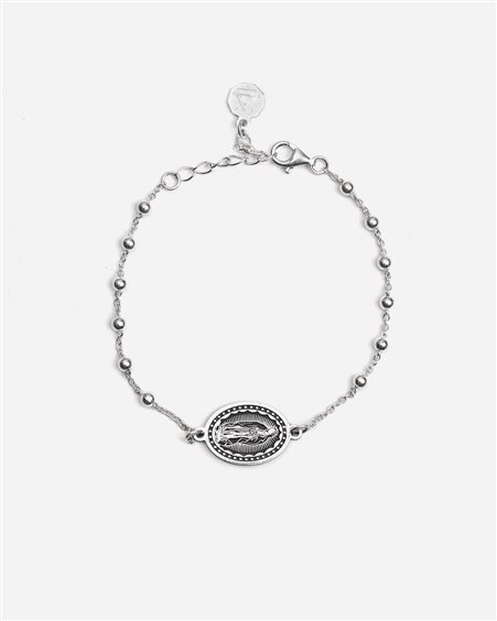 Il bracciale GUADALUPE, con i suoi grani in argento, ricorda un rosario. La madonna incisa sul ciondolo è un simbolo religioso di protezione, spesso inciso anche sulla pelle di chi ha fede nel perdono e nella redenzione. Il Bracciale Guadalupe fa parte della Collezione Traditional ed è realizzato in Argento 925. Come tutti i gioielli Nove25 anche questo Bracciale viene progettato e lavorato in Italia mediante l'utilizzo delle più moderne tecnologie e rifinito a mano per garantirne il massimo dettaglio e la più elevata qualità. Questo gioiello viene proposto con una finitura Brunito Lucido ed è disponibile in taglia unica da 17 cm.