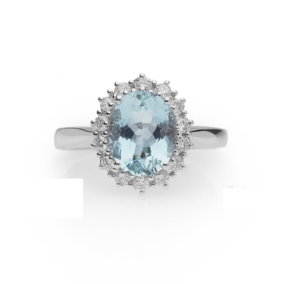 Anello in oro bianco 18 kt con Acquamarina di kt 1.95 e diamanti taglio brillante di kt 0.23 VVS1 G Color