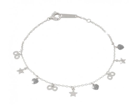 Bracciale Rebecca della collezione Jolie in argento, con ciondoli pendenti a forma di cuore, stella ed infinito impreziosite da polvere di diamante. Chiusura con moschettone.