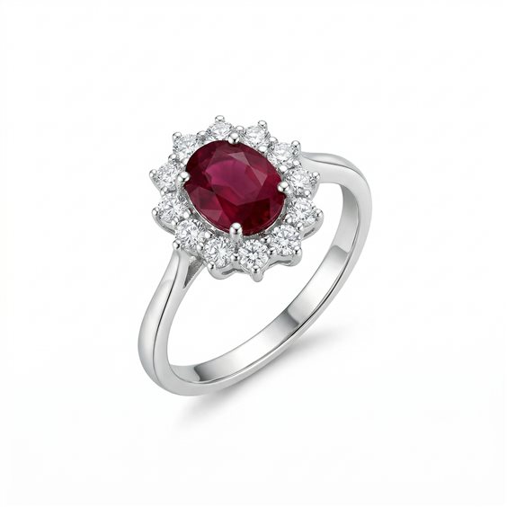Splendito anello con gemma rubino centrale taglio ovale provenieza Madacascardar dal peso di ct 0,96 incastonata centralmente su di un anello in oro bianco del peso complessivo di gr.5,00e con lateralmente incastonati n°10 diamanti naturali di forma rotonda con taglio brillante del peso complessivo di ct. 0,73 Color G purezza IF. CORRELATO DA CERTIFICAZIONE N° S51203 rilasciato dal Centro Analisi Gemmologiche di Valenza (AL) Correlato da Certificato di Sostituzione gratuito valido 3 anni, qualora lo stesso venga rubato, scippato, rapinato o venisse distrutto da incendio.