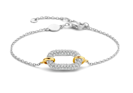 Questo bracciale d'argento placcato oro TI SENTO - Milano 23007ZY colpisce per l'elemento centrale rivestito di pavé di zirconi bianchi e impreziosito da due anelli placcati oro. È realizzato in argento sterling 925 e rivestito di uno strato di rodio per una maggiore protezione e una lucentezza che dura nel tempo. La misura regolabile consente una perfetta vestibilità. Porta la sua splendida luce sempre con te.
