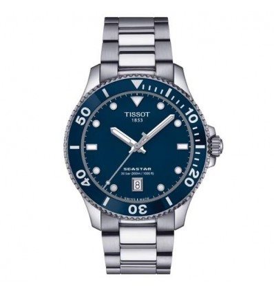 Orologio Tissot Seastar 1000 40 mm, solo tempo donna e uomo. Cassa in acciaio silver da 40 mm, quadrante blu con indici e lancette luminescenti,e datario alle ore 6. Lunetta girevole unidirezionale blu con inserto in vetro minerale, corona a vite. Vetro zaffiro antigraffio con trattamento antiriflesso, movimento al quarzo, e cinturino in acciaio silver. Impermeabilità di 30 atm (300 metri).