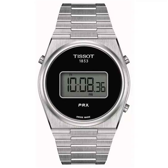 Orologio da uomo di Tissot T-Classic della collezione Tissot Prx. Orologio con movimento svizzero, al quarzo e resistenza all'acqua di 10 bar (100 metri/330 piedi). Cassa in acciaio inossidabile 316L a forma tonneau. Quadrante di colore nero. Vetro zaffiro antigraffio. Cinturino in acciaio inossidabile di colore grigio. Bracciale intercambiabile a sgancio rapido e chiusura a farfalla con pulsanti.
