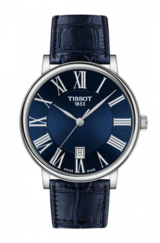 Orologio uomo solo tempo. Cassa in acciaio 316L lucido modello cannelèe. Movimento al quarzo Swiss Made ore minuti secondi data. Vetro zaffiro antigraffio. Quadrante blu con cifre romane argento opaco, lancette lucide. Cinturino in pelle blu scuro stampa alligatore, fibbia con ardiglione e logo. Scatola libretto e garanzia 2 anni originali.