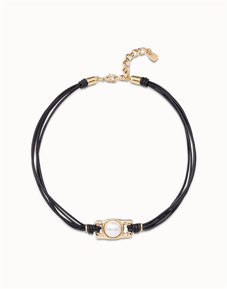 Collana corta formata da quattro fasce di cuoio impreziosite da un charm centrale con una perla. Dispone di una chiusura a moschettone che permette di regolare la collana alla lunghezza desiderata. È realizzata in Spagna utilizzando tecniche artigianali, in lega di metalli placcati argento.
